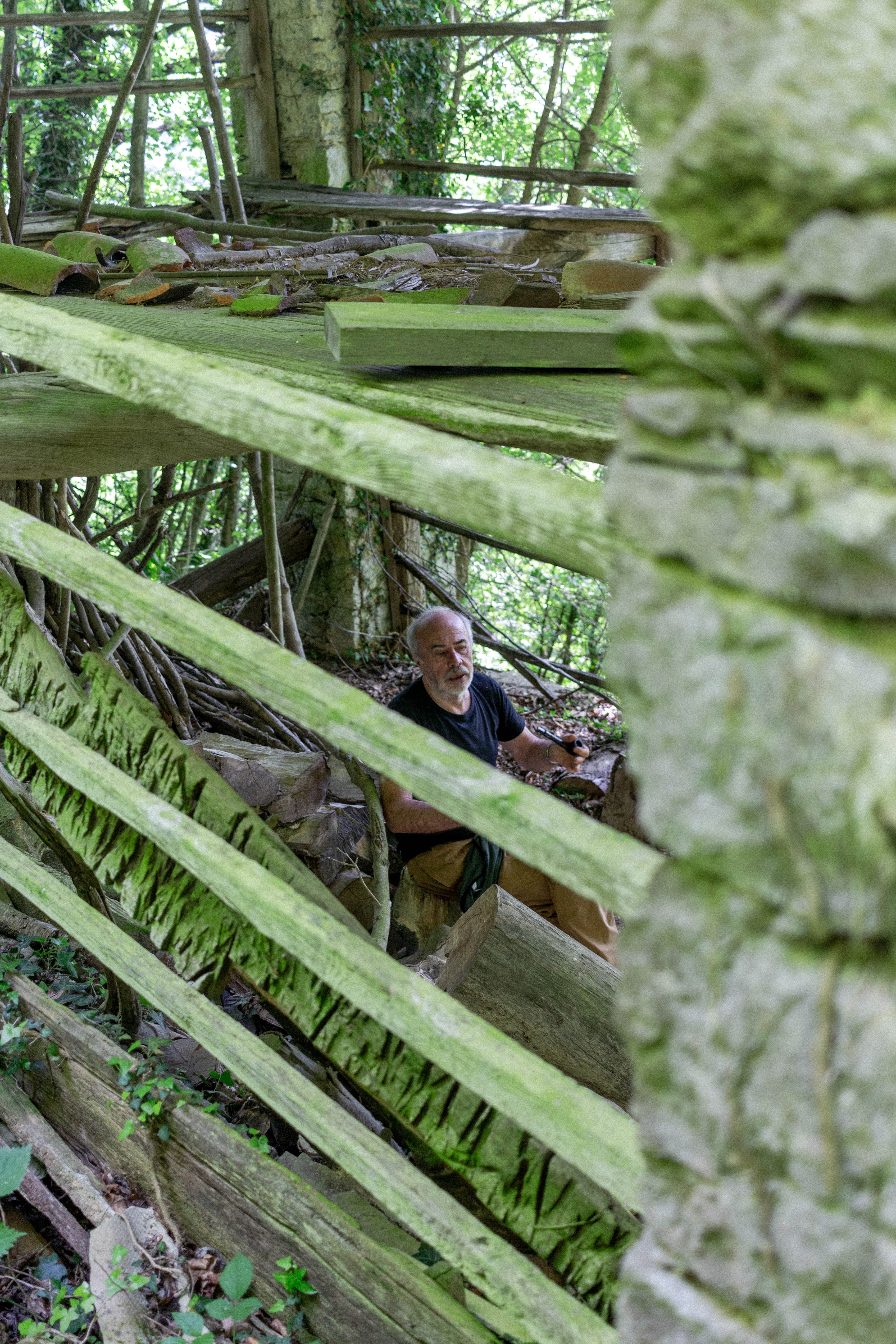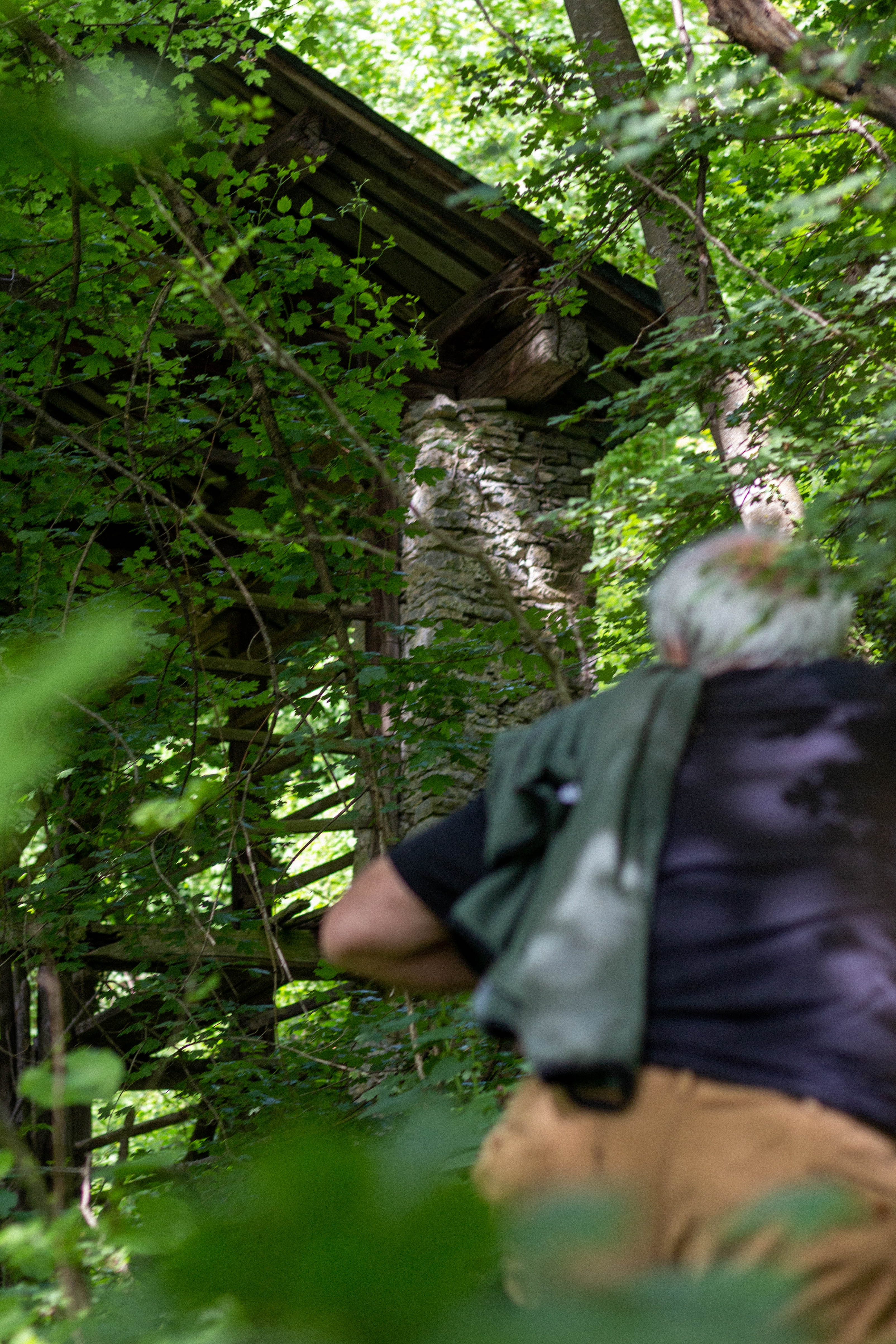 Nonostante siano stati abbandonati da decenni, le reliquie agrarie che avevano catturato l’immaginazione di Renzo si possono ancora trovare in buone condizioni – se si sa dove cercare. Così, all’inizio della primavera del 2025, sono andato con Renzo Rucli nel bosco per trovare una rovina: uno dei kozolci, coperto dalla vegetazione, che Renzo aveva studiato un quarto di secolo prima.