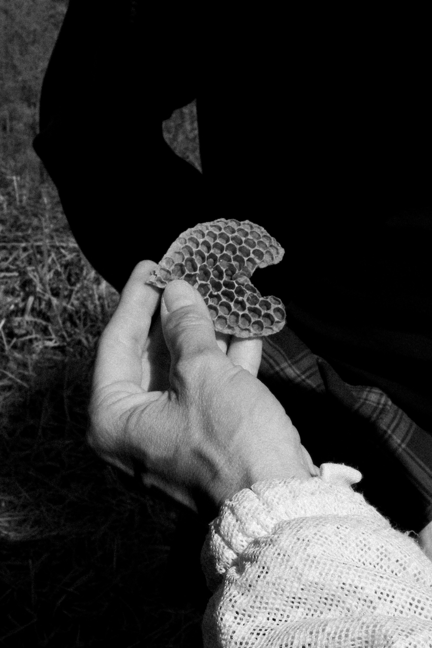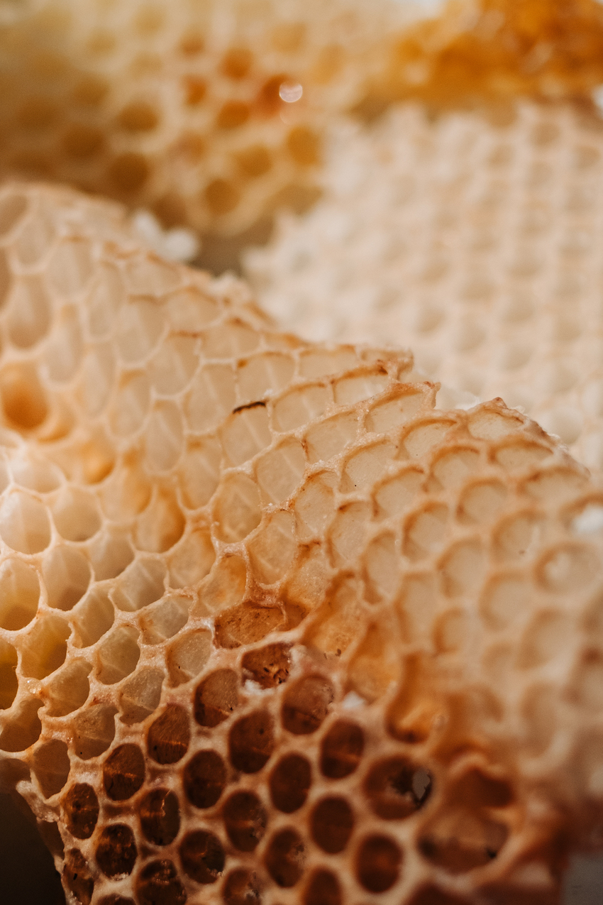 Spostando l’obiettivo dell’apicoltura dalla produzione di miele all’arte della vita/arte della sopravvivenza, le api si mostrano in modo più diversificato. L’architettura dei favi è un’opera d’arte a sé stante e leggere i favi di cera è un buon modo per studiare lo sviluppo dell’alveare. Il miele è prezioso e considerato un extra. Siamo generosi con le api, perché la generosità è una buona risposta all’abbondanza. Lo sviluppo del superorganismo risponde all’abbondanza. Le sculture di cera si sviluppano solo quando le api hanno lo spazio per costruirle e quando c’è abbastanza nettare da spingerle a produrre miele. Massimizzando lo spazio e riducendo al minimo lo sfruttamento, c’è sempre una sorpresa quando si apre l’alveare. Persino il miele ha un sapore diverso perché porta con sé un odore di cera, che dopo un po’ scompare. La traccia della permeabilità della cera d’api fresca.